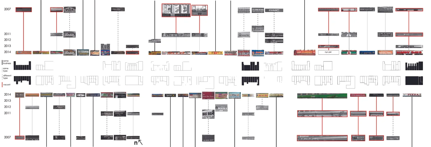 This project uses interviews, field observations and Google street view images to track the tenure of businesses on the rapidly changing Knickerbocker Avenue in Bushwick. While the changes in residential populations and rent prices are known to have changed drastically in the neighborhood in the last ten years, little research has been done on the impact of gentrification on commercial businesses. These maps show the turnover and vacancies within six blocks since 2007.
